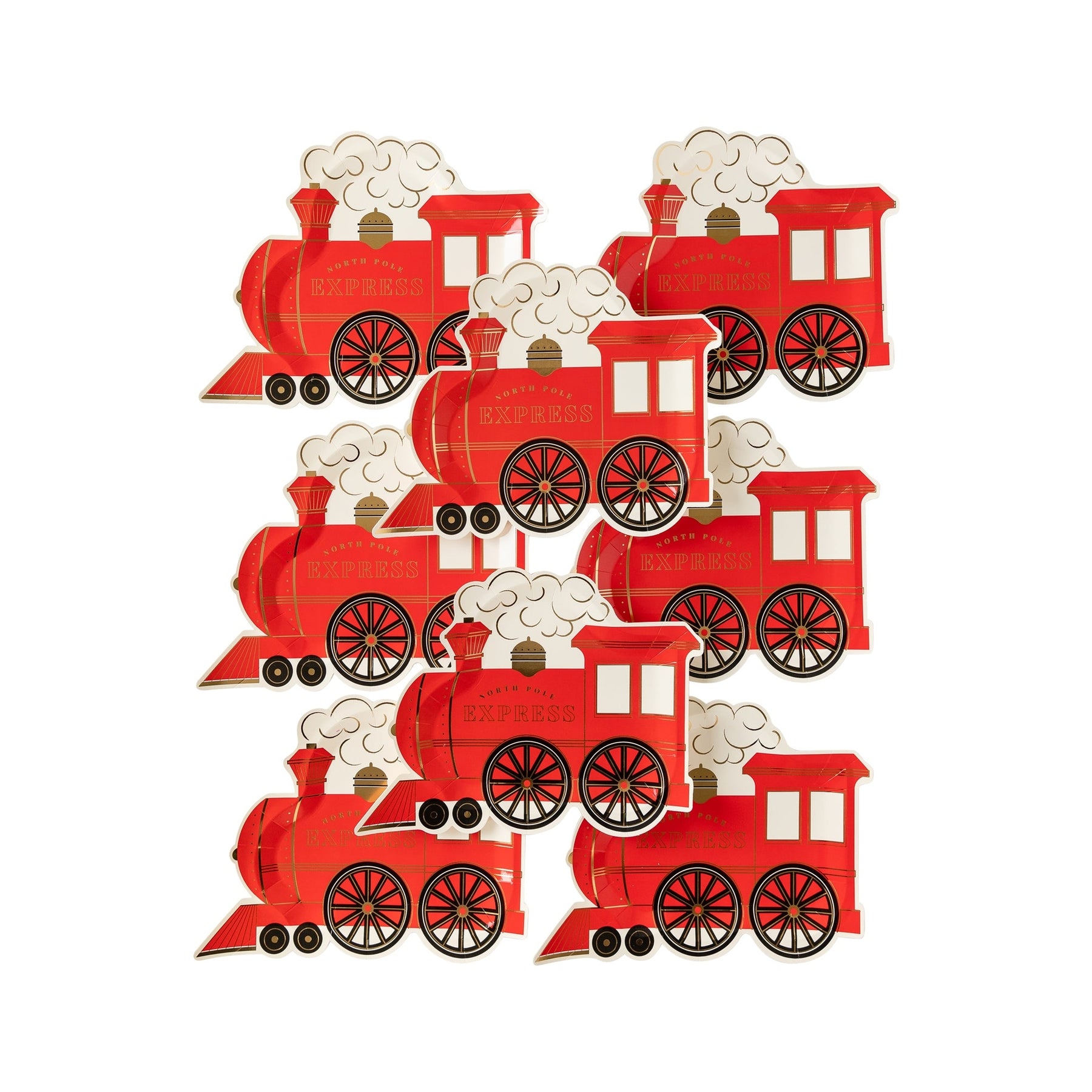 These party plates are a merry addition to any Christmas dinner on a train expedition to the North Pole. They are a festive Christmas train shape, and are sure to put a twinkle in your guests' eyes with their glittery gold foil accents. All aboard!