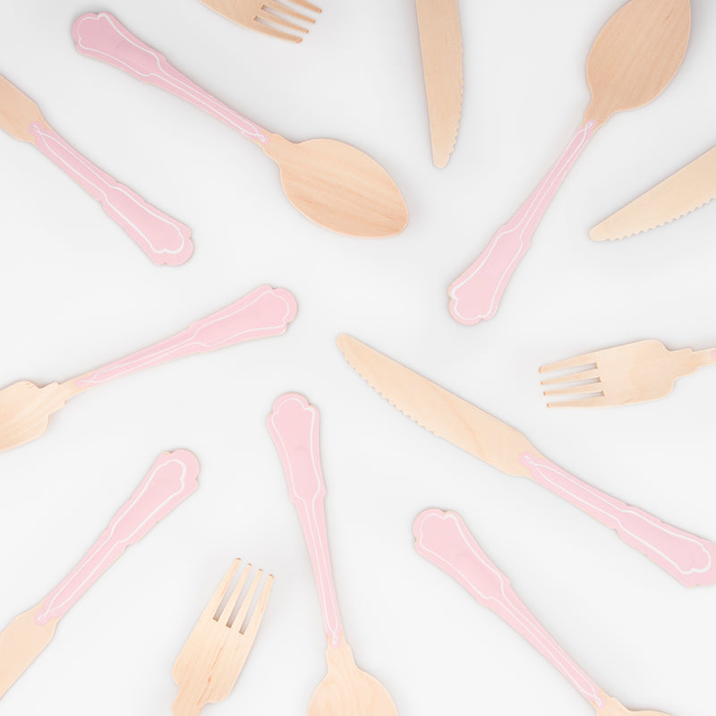Looking for a statement-making disposable cutlery option? Our wooden cutlery sets are anything but ordinary, adding a touch of whimsy to your table. With a nod to elegance, these sets are perfect for picnics, garden parties, princess and fairy parties, BBQs, camping trips, or when you just don't feel like doing dishes. These sets feature playful pink handles that perfectly match the rest of your tableware.
