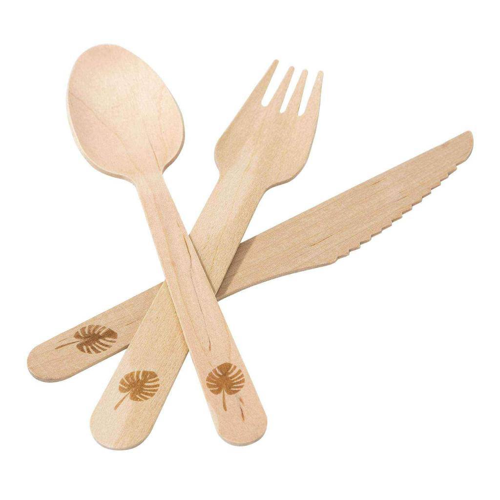 Transport your guest of honour to a tropical destination with this fun tropical leaf motif disposable wooden cutlery set. Can be used for a wide range of party themes even dinosaur or safari!