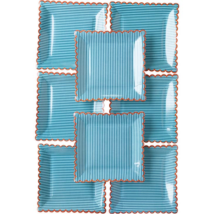 These blue striped party plates can bring a delightful Americana vibe to your gatherings. They feature a blue-on-blue stripe design complemented by a red scalloped edge and are perfect for any Memorial Day picnics, Fourth of July cookouts, or even a nautical themed birthday party.