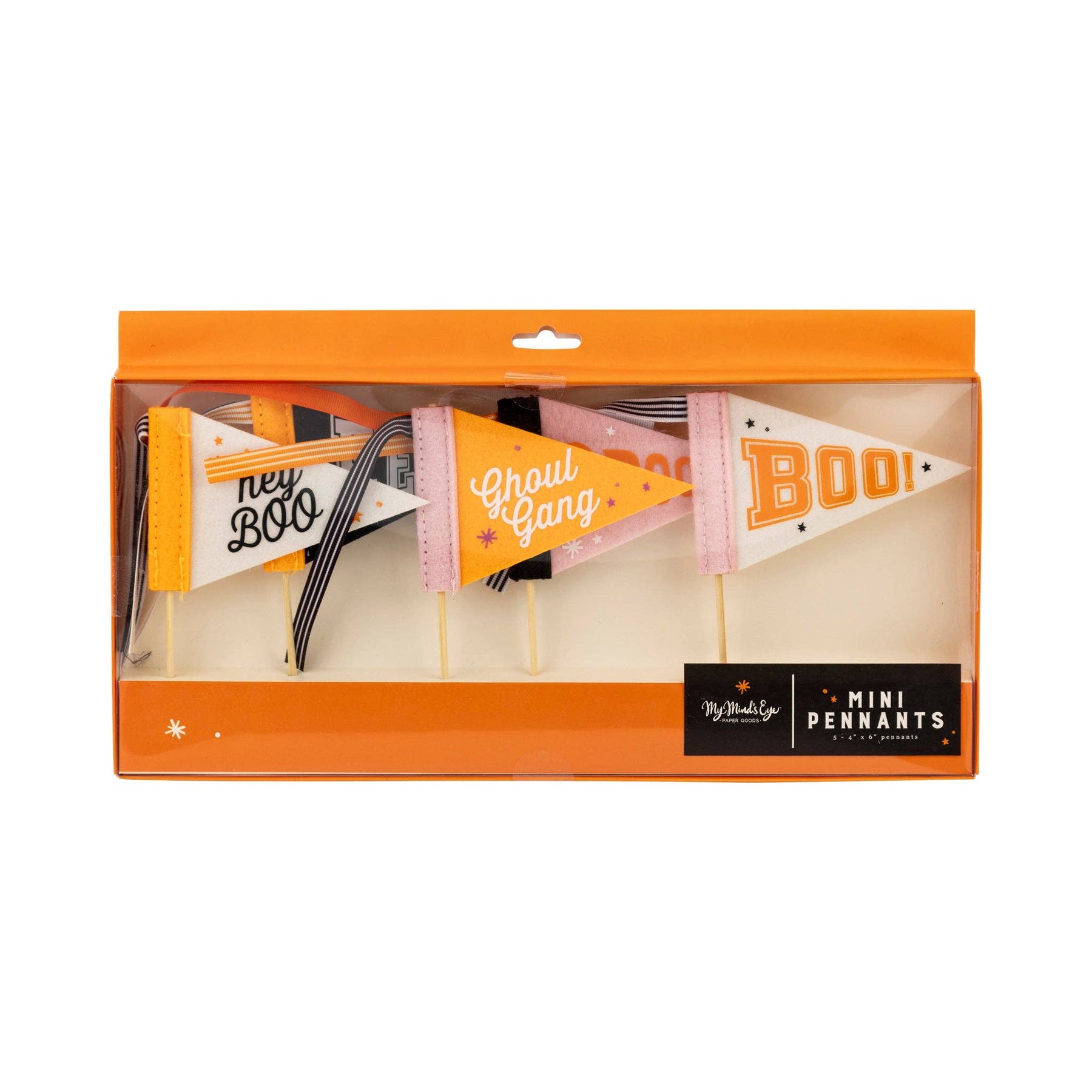 Decorate for Halloween with these mini felt pennant banners. The perfect addition to any spooky celebration, these banners add a playful touch to your decor. Hang them up at your next Halloween party or use them to bring some holiday spirit to your home.