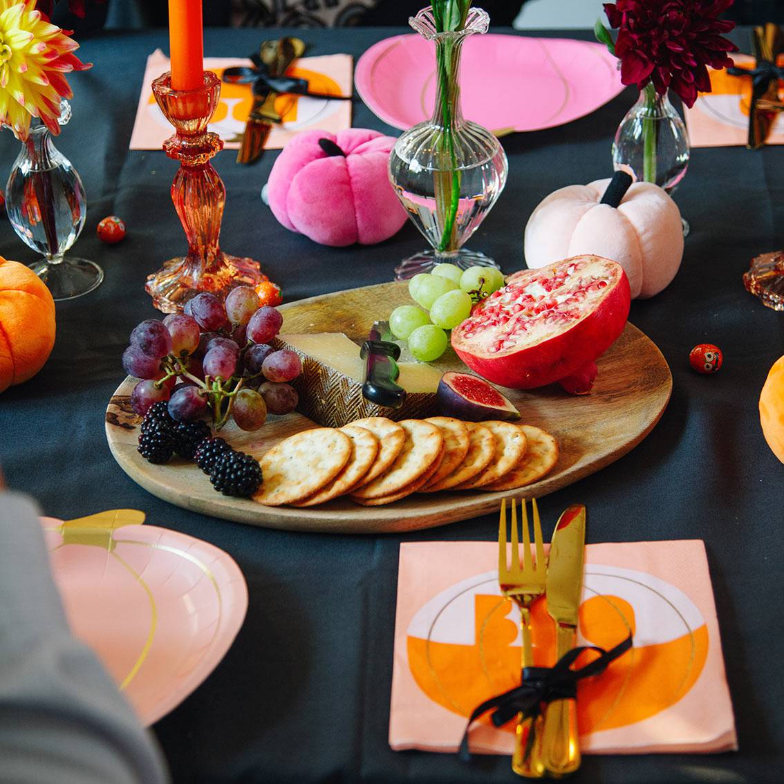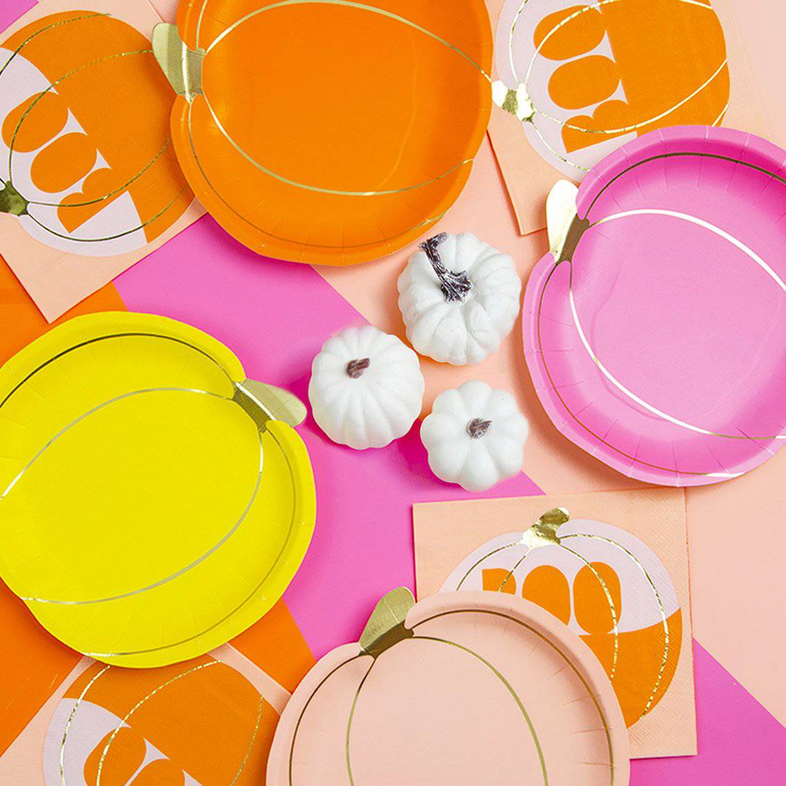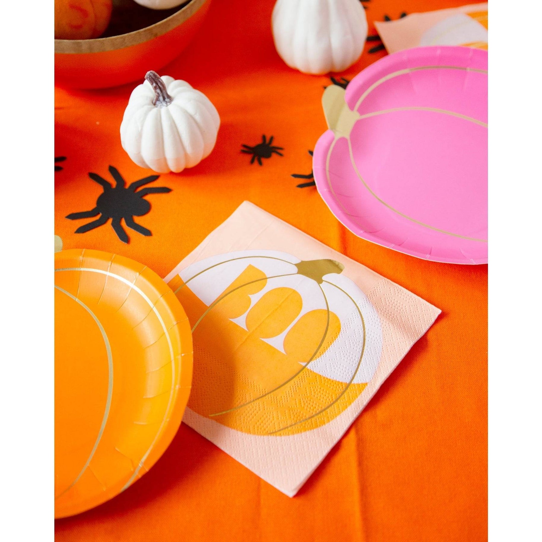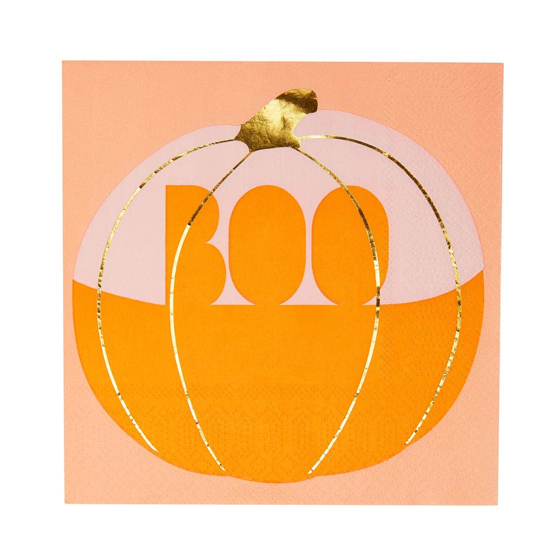 Pack of 16 Pumpkin Napkins by Talking Tables. Each orange paper napkin features a 'boo' pumpkin carving design with eye-catching gold foil detail. The perfect addition to your stores collection of Halloween tableware and ideal for your customers to use for a Halloween Party or Autumn dinners. Pair with the rest of our pumpkin themed tableware and Halloween decorations to complete the look.