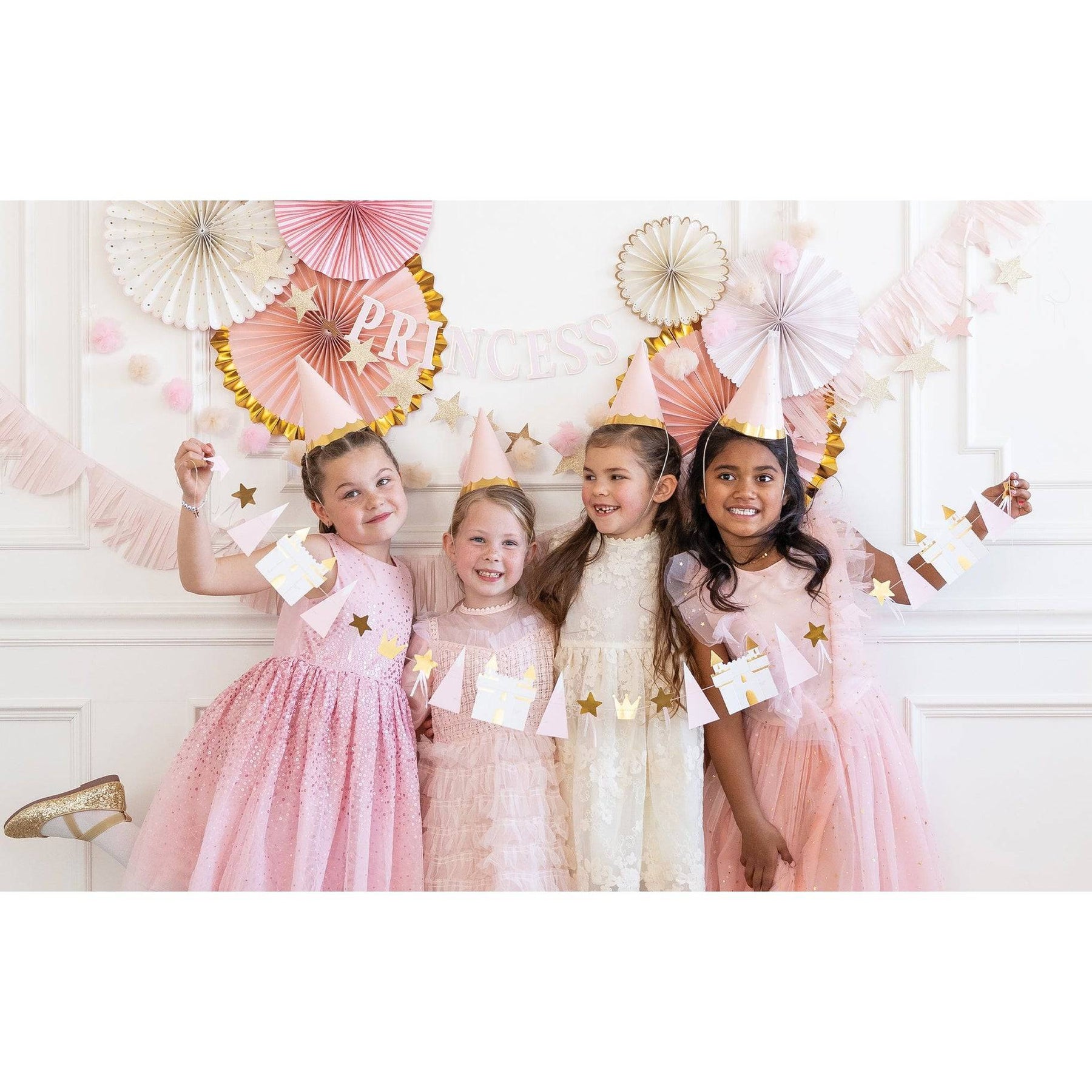 Create a magical fairy tale for your princess with this whimsical icon banner. This banner includes story book icons with gold foil accents that will transform any space into magical kingdom fit for your princess. Perfect for princess themed birthday parties or to decorate your little girl's room!