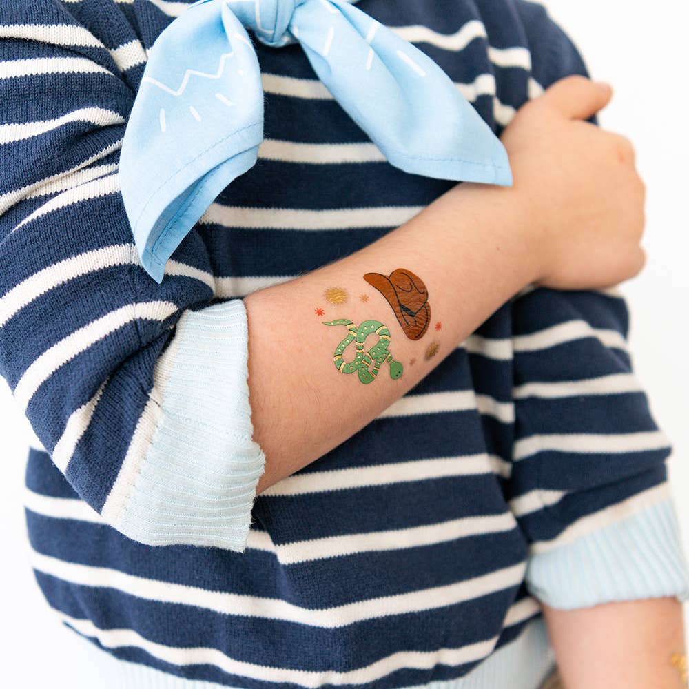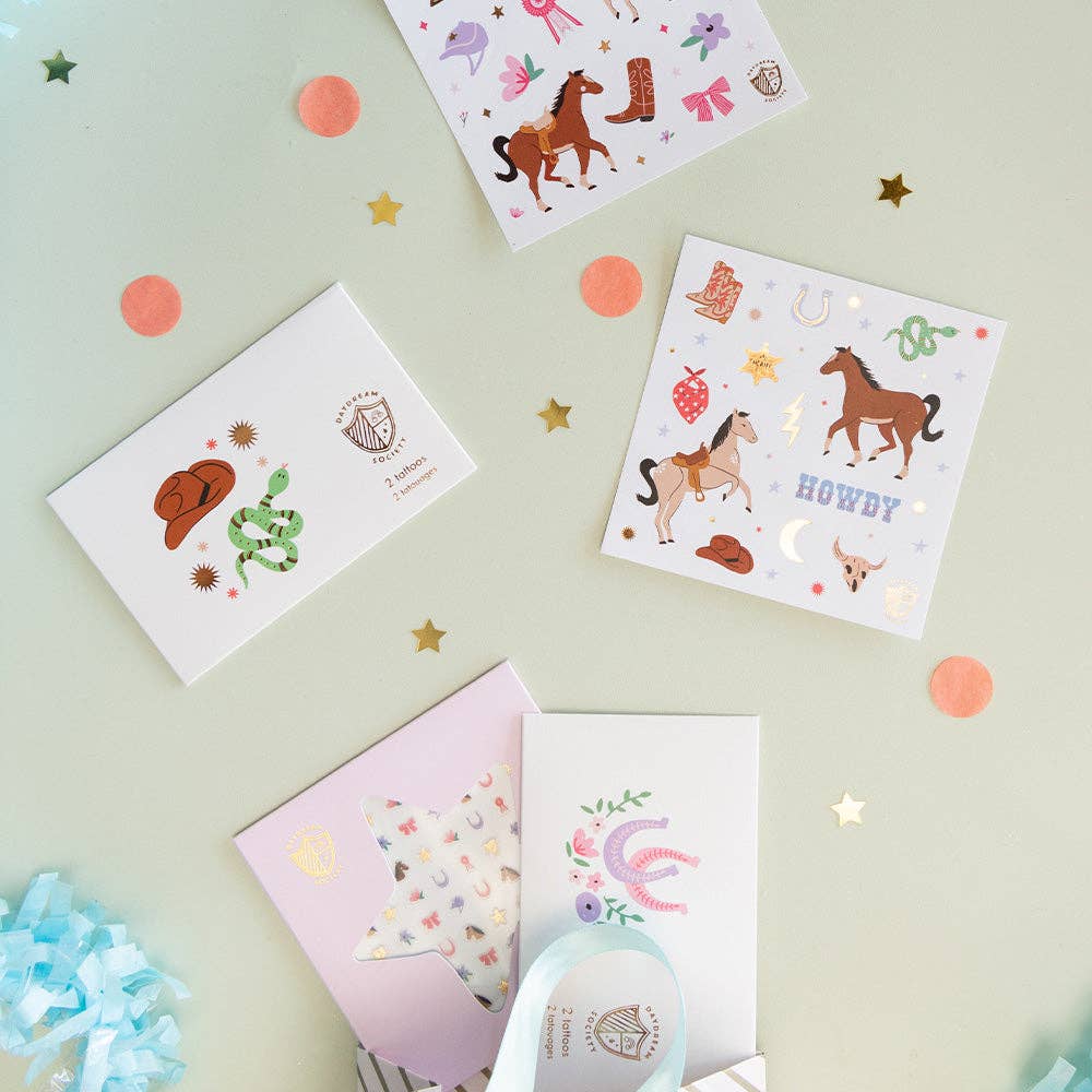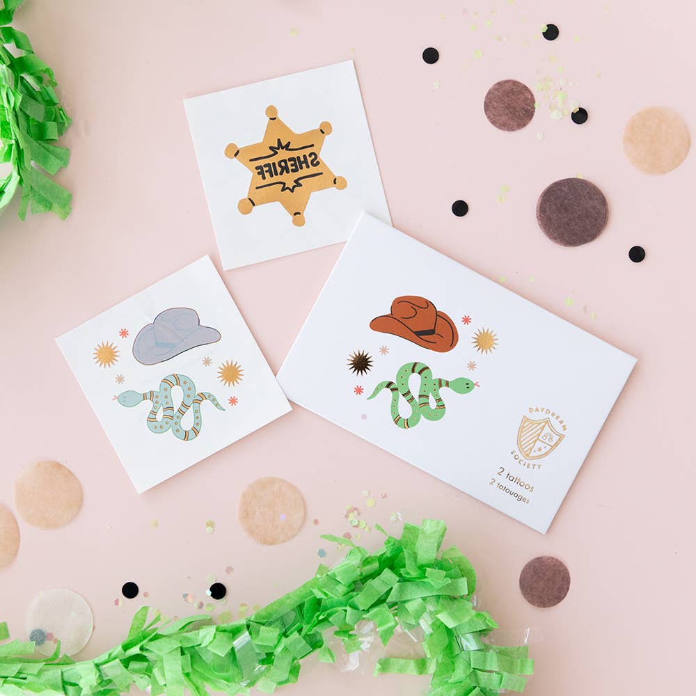 Add some cowboy flair to your event with Yeehaw Temporary Tattoos! These party favors feature classic cowboy symbols like the sheriff badge and cowboy hat in shiny gold foil. Get ready to wrangle up some fun with these playful tattoos!