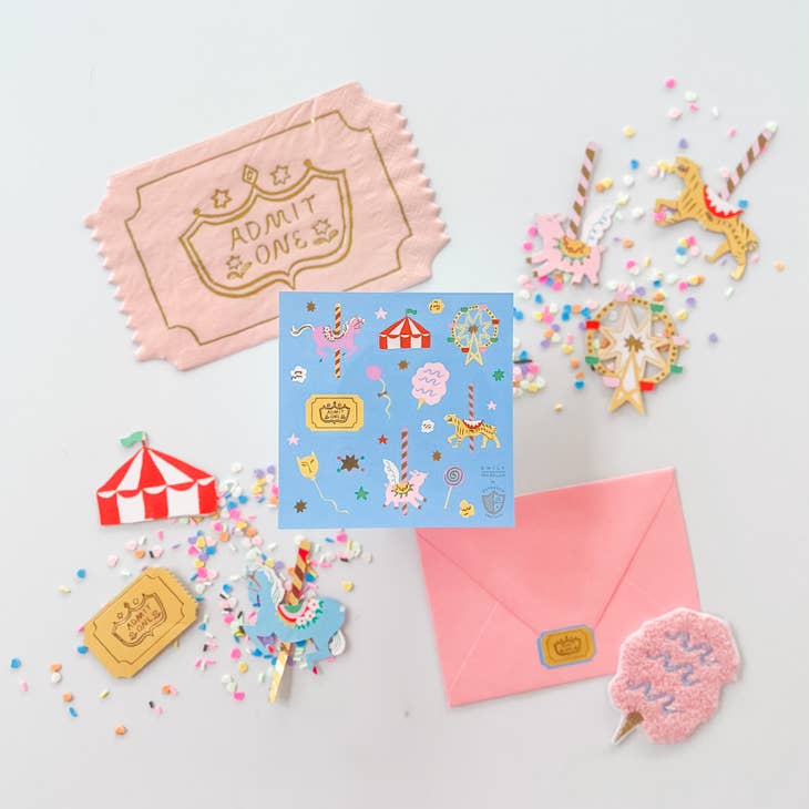 Get ready for the ultimate fair experience with our Off to the Fair Sticker Set! With vibrant carnival-inspired colors and touches of gold foil, these stickers are perfect for adding a whimsical touch to fair, carnival, and circus parties. Let the carousels and cotton candy come to life with this 4-pack set.