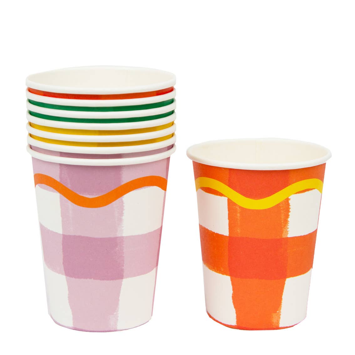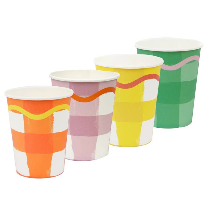 Whatever the occasion, these fun gingham paper cups are ready to hold refreshments for your guests. In green, yellow, purple and orange, these paper cups are ideal for brightening up a spring dinner settings, an Easter table or birthday party. We have designed these recyclable cups to be eco-friendly with no plastic in the product or packaging. Simply rinse and put into a recycling bin after use.
