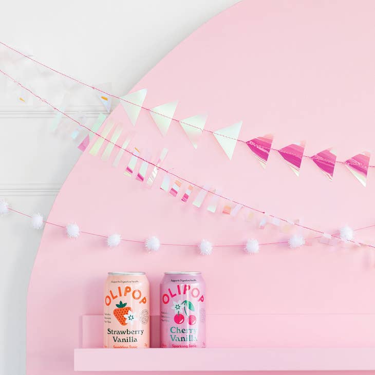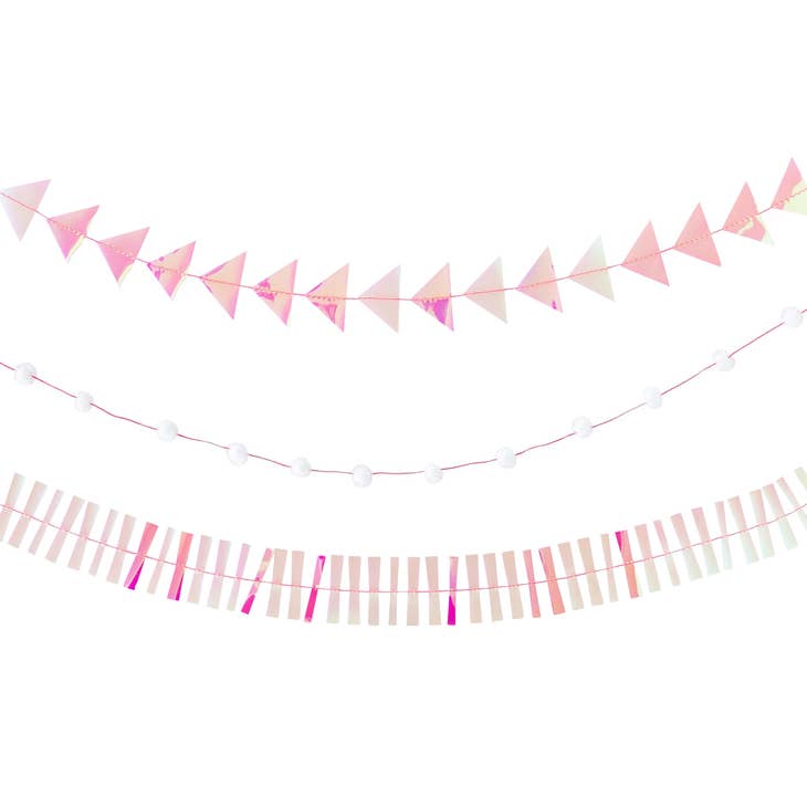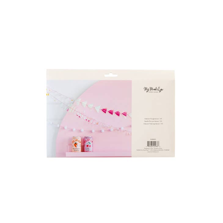 Make sure that your day has all the sparkle that it needs with this iridescent mini banner set! With iridescent foil ticker tape and triangle banners and a silver pom pom banner these set adds the perfect finishing touch to party spaces and everyday spaces alike. This versatile banner set is perfect for a quick birthday party set up in the break room or adding shimmer to your princess, unicorn or mermaid themed party.