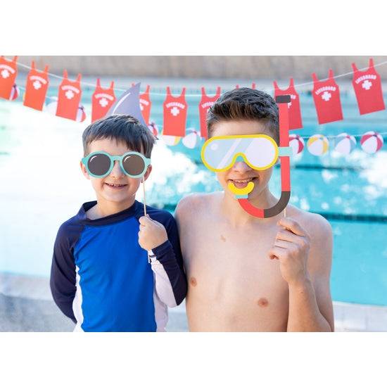 Photo Prop Kit Includes: • Sunglasses • Goggles • Snorkel Mask • Small Shark Fin • Large Shark Fin • Pool Drink • Life Preserver Glasses • "Splish Splash" Word Bubble
