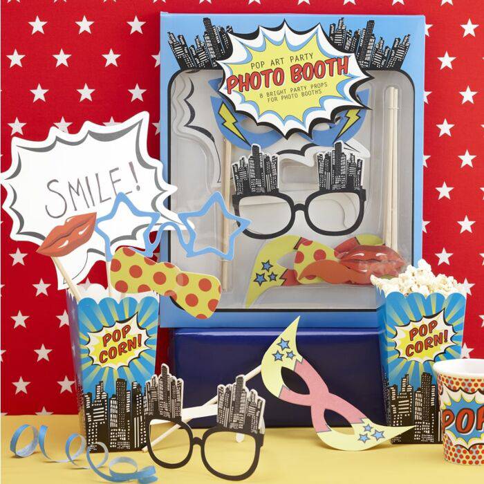 A pack of Pop Art photo booth party props on individual sticks to give your guests a bit of eccentricity and liven up your party photos. Can be used in a photo booth or just with a regular camera.
