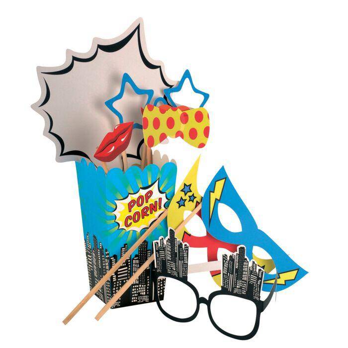 The pack contains 8 different props made of card; two masks, a pair of city building glasses, a pair of luscious red lips, a red moustache, a spotty bow tie and a pair of blue star shaped glasses. Great for lots of special occasions from an adults 30th birthday party to a kids superhero themed party.