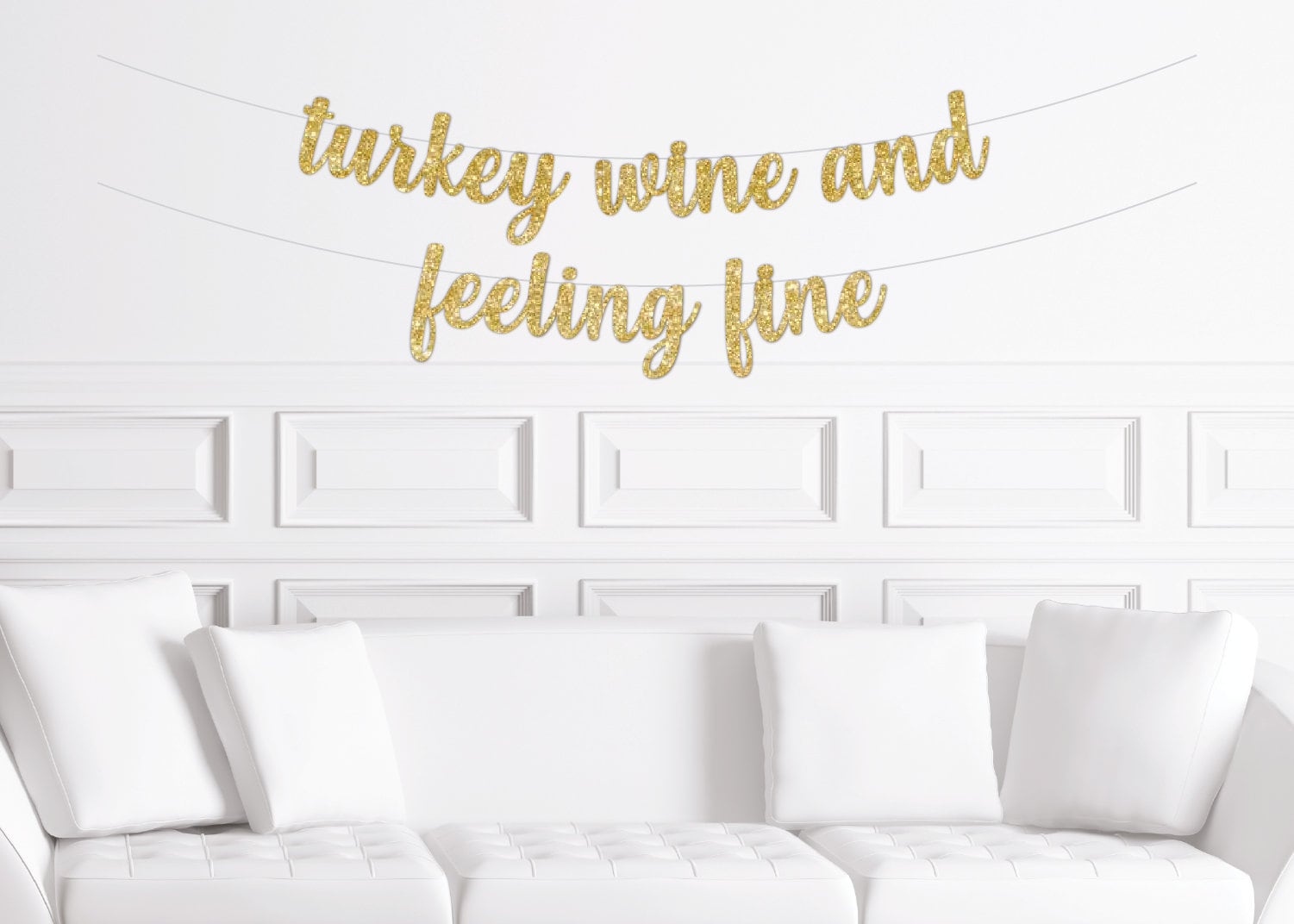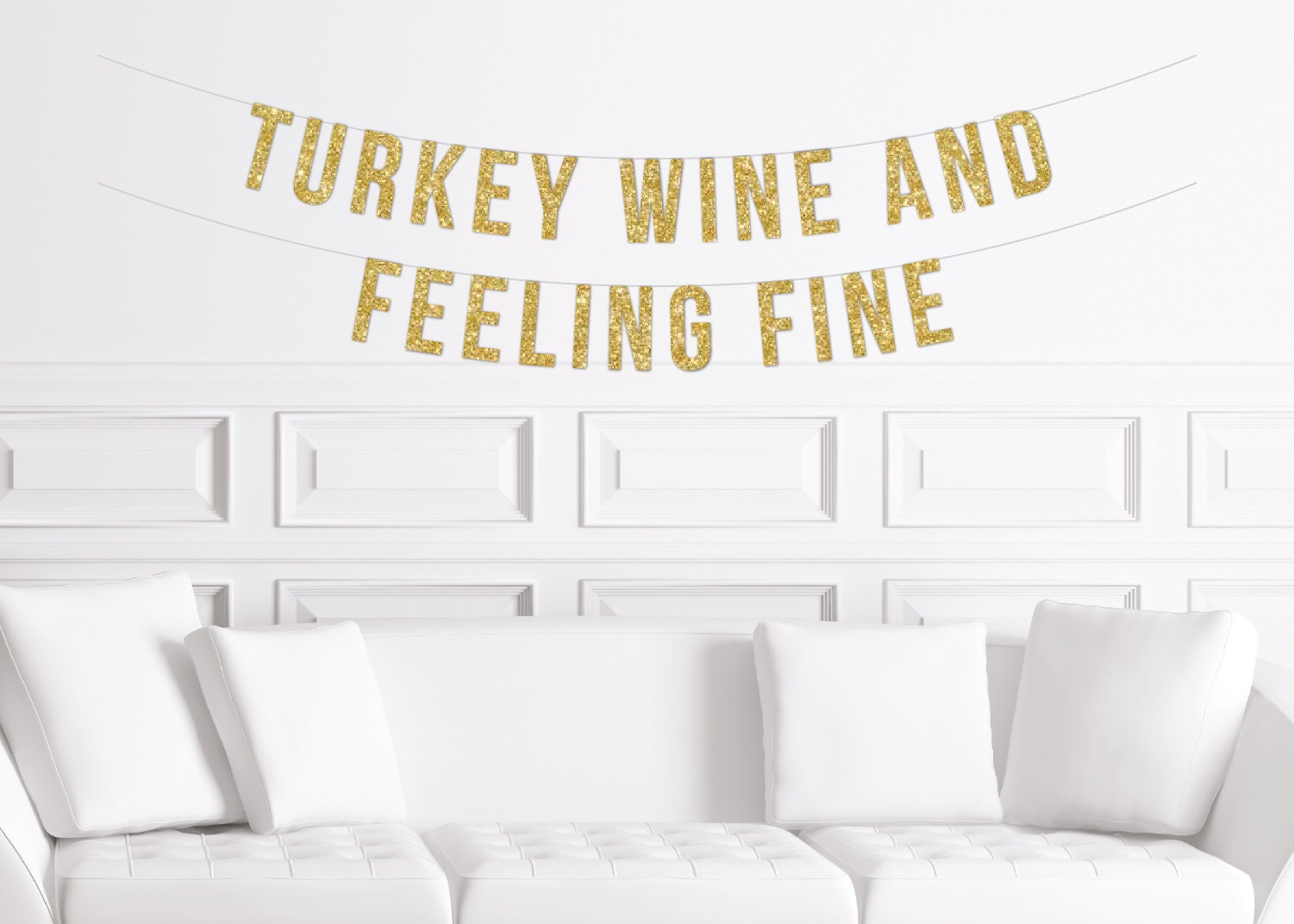 Fun Thanksgiving Banner, Turkey, Wine and Feeling Fine Sign for Thanksgiving Dinner, Friendsgiving Dinner