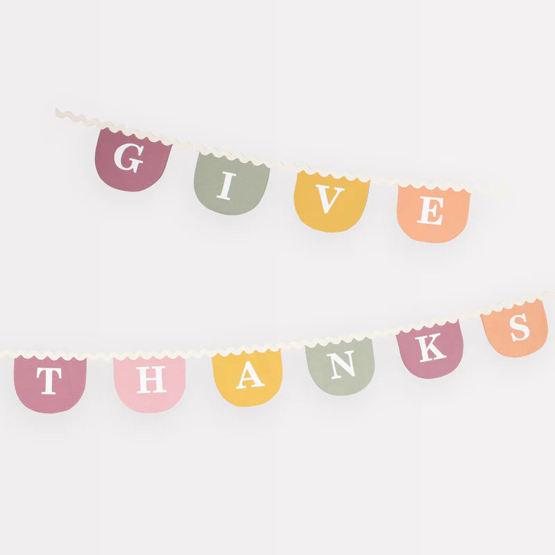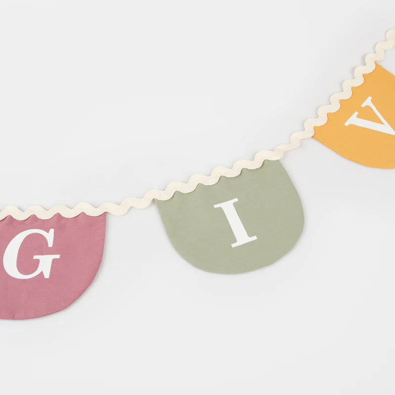 Add a touch of whimsy and warmth to your Thanksgiving festivities with the Meri Meri Thanksgiving Fabric Garland. Featuring trendy ric rac accents and a heartfelt 'Give Thanks' message, this garland can be hung on walls, mantels, porches, or party tables. Plus, it comes in a reusable organdie bag for easy storage. Celebrate in style year after year with this fabulous garland.