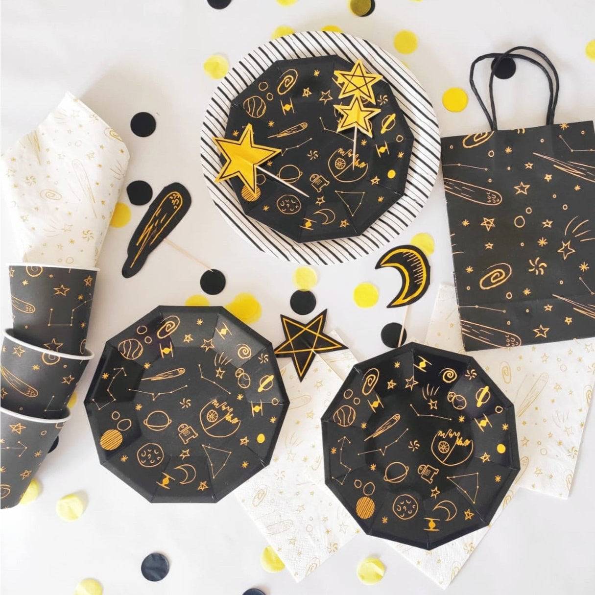 Featuring yellow and dark colors, these planets party bags are inspired on space adventures and are perfect to fill with galactic treats! Designed by Pooka Party