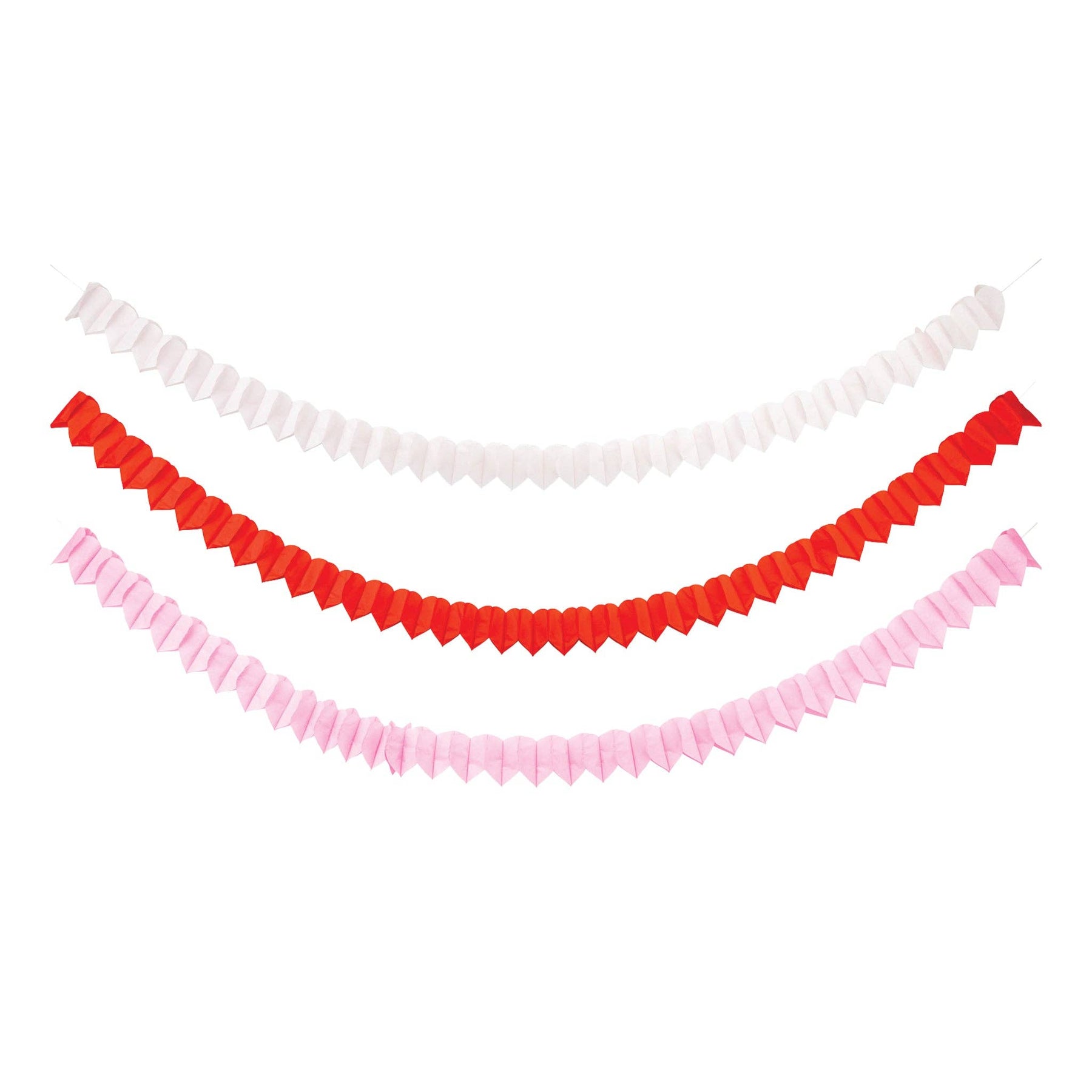 • Light pink, medium pink, and red honeycomb tissue paper heart garland, set of three