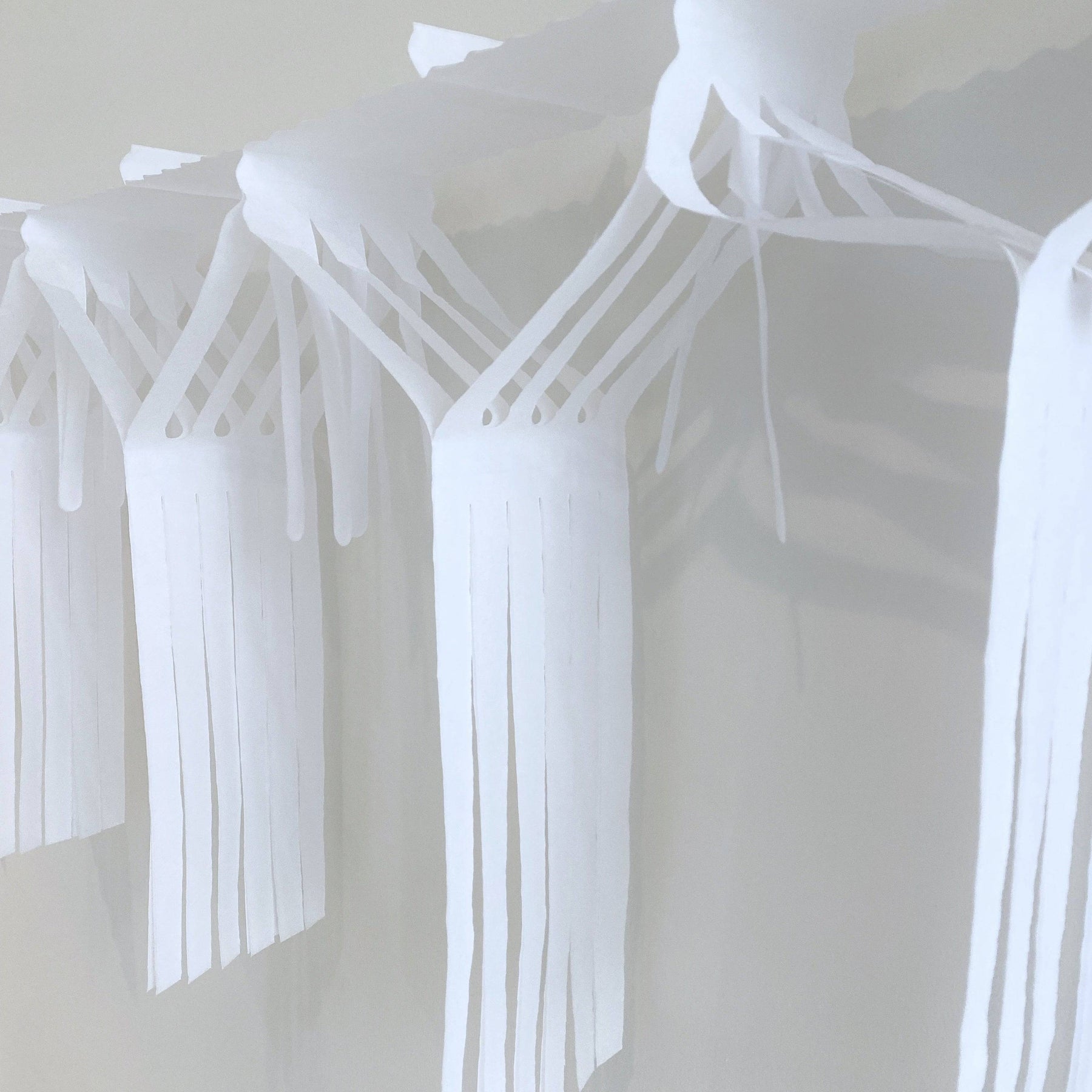 These ivory tissue paper streamer macrame garlands are a popular choice for weddings, baby showers, engagement, Christmas or holiday parties, quinceanera, and seasonal display decor. Streamer garlands can hang along a wall, table edge, or balcony. Create a festive backdrop in minutes with an assortment of tissue paper garlands and honeycomb decorations.