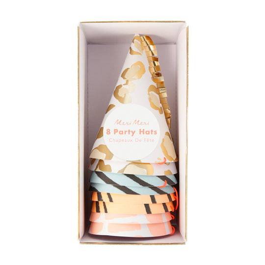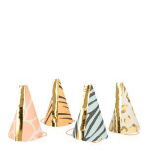Rawr! If you're holding a safari-themed party, you will love these sensational Safari Animal Print party hats. Featuring different colored designs with gorgeous gold foil details and gold foil fringing, to make your guests look amazing!