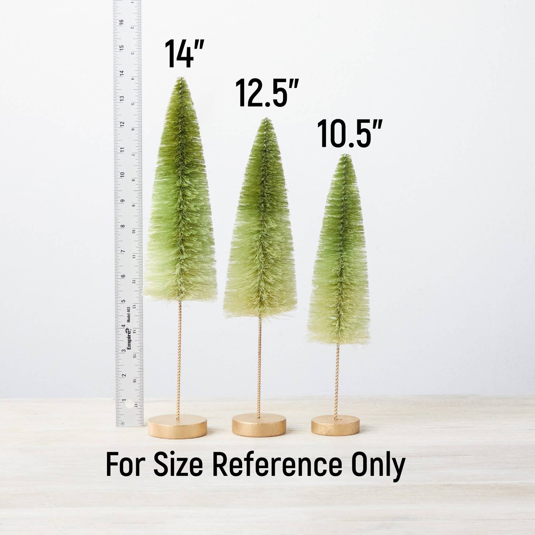 SMALL tree is 10.5" tall by 2.5" wide MEDIUM tree is 12.5" tall by 2.5" wide LARGE tree is 14" tall by 3" wide