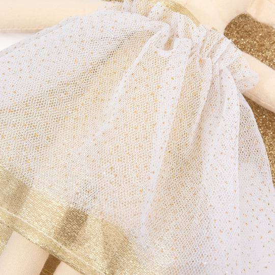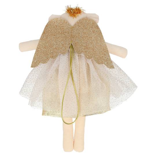 - She has sweet stitched features, a taffeta gold dress, gorgeous glitter wings and a fabulous tinsel halo