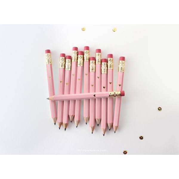 This adorable set of 12 sweet mini pencils comes foil-imprinted with a tiny gold heart. With a gold ferrule and classic pink eraser, pencils come pre-sharpened and are perfect for any Valentines and birthday party games or favors.