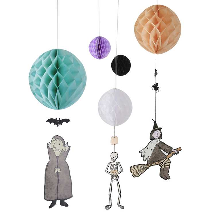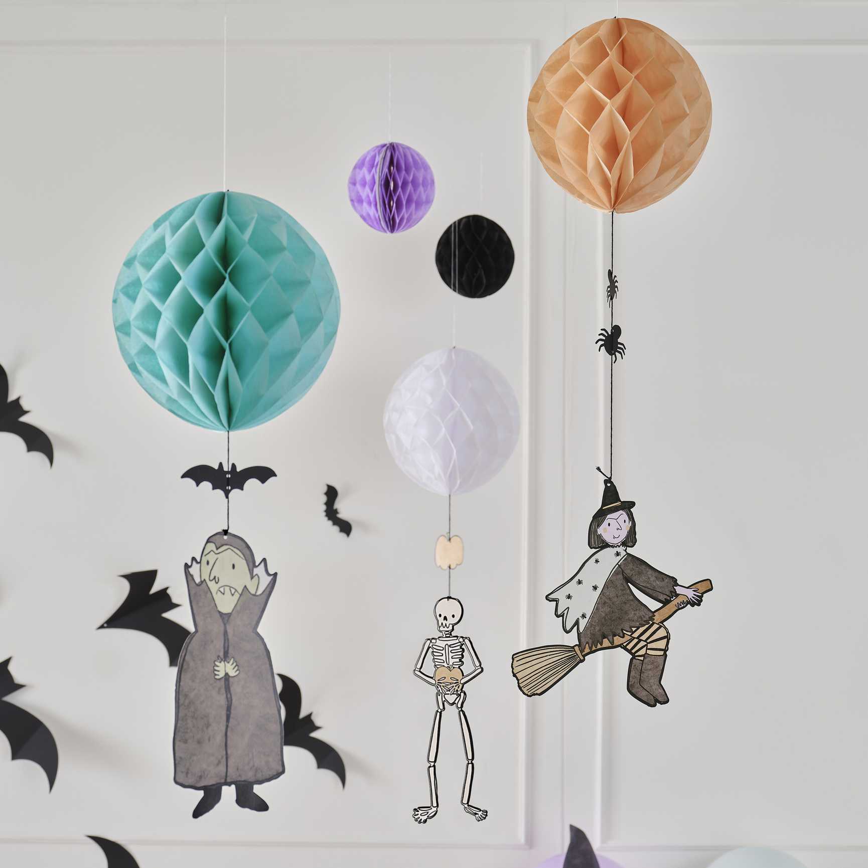 Decorate for the spooky season with these fun character Halloween honeycomb decorations. These Halloween hanging paper party decorations can easily be hung from walls, doorways and around your room to create a fun Halloween party.