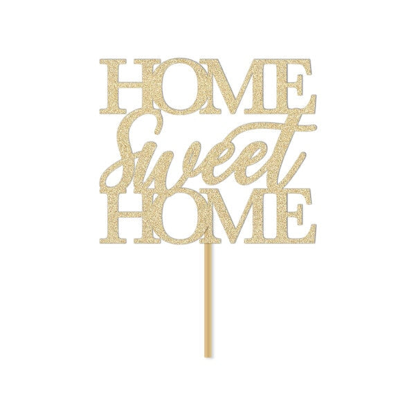 This listing is for one gold glitter cake topper with the popular housewarming party saying: