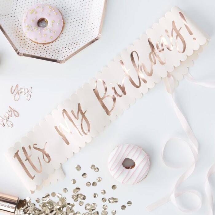 Make the birthday girl feel super special with her very own 'Rose Gold Birthday Sash'. The rose gold writing looks stunning on the soft pink background. A stylish sash for a special day!