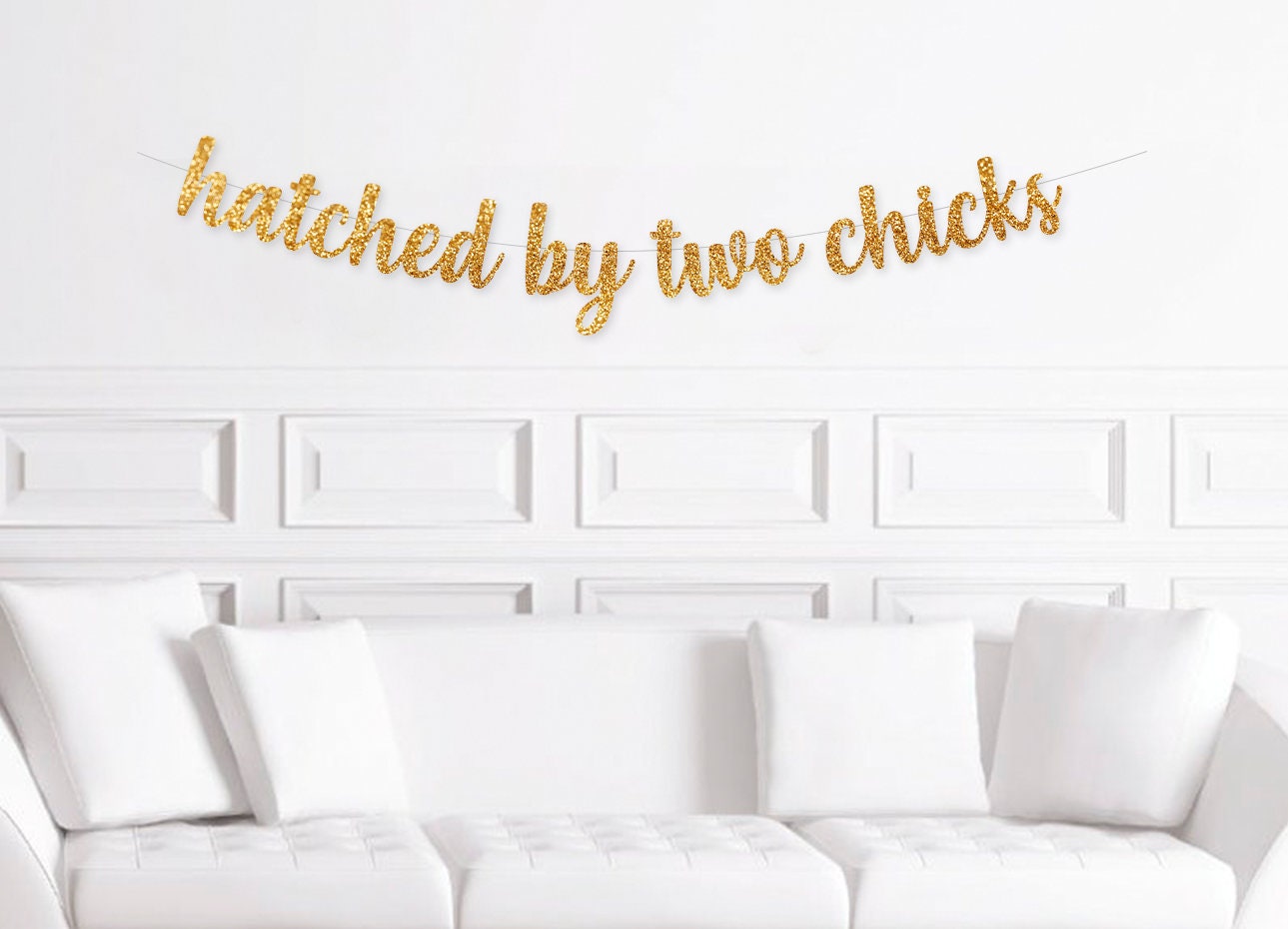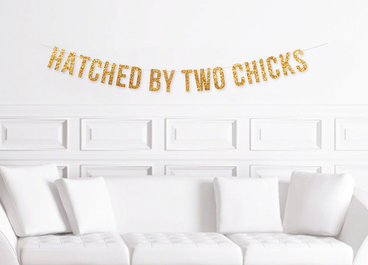 Lesbian Baby Shower Banner, Funny Gay Sip and See Party Decorations, Hatched By Two Chicks Baby Shower DecorHATCHED BY TWO CHICKSSize: 5" tall lettersSelect font style, color and stringing options.