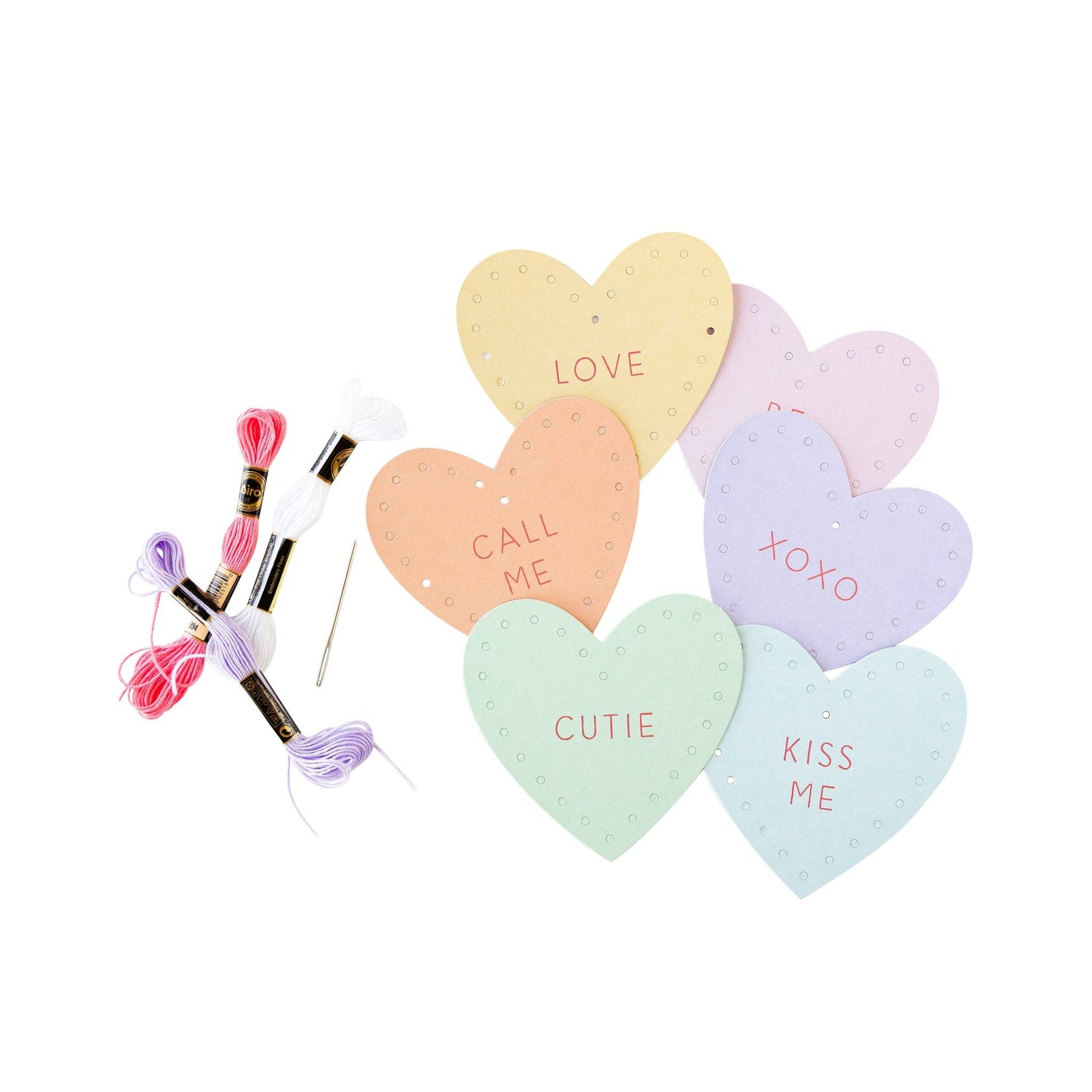 • includes 3 hearts, thread and blunt needle