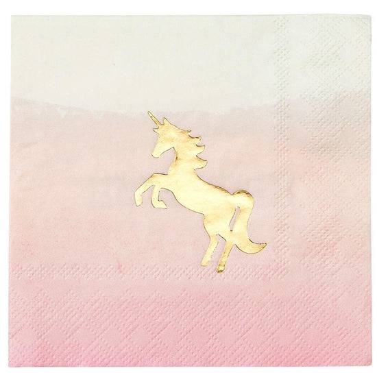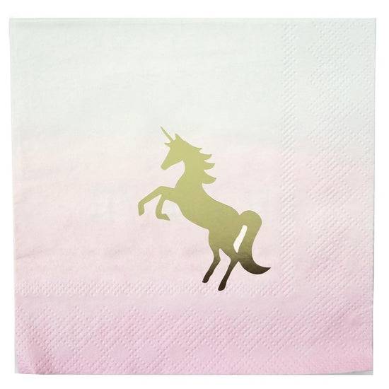 Stunning pink and gold unicorn napkins, featuring the phrase ‘I believe’ on the revere for an added touch of magic.Each pack contains 16 paper cocktail napkins featuring a shiny gold foil unicorn, eye-catching and trendy! Size 25cm x 25cm unfolded.This napkin features a shiny foil finish on one side, perfect for a place setting. We cannot cover all sides with foil as it is applied by hand and is less sustainable for the planet.