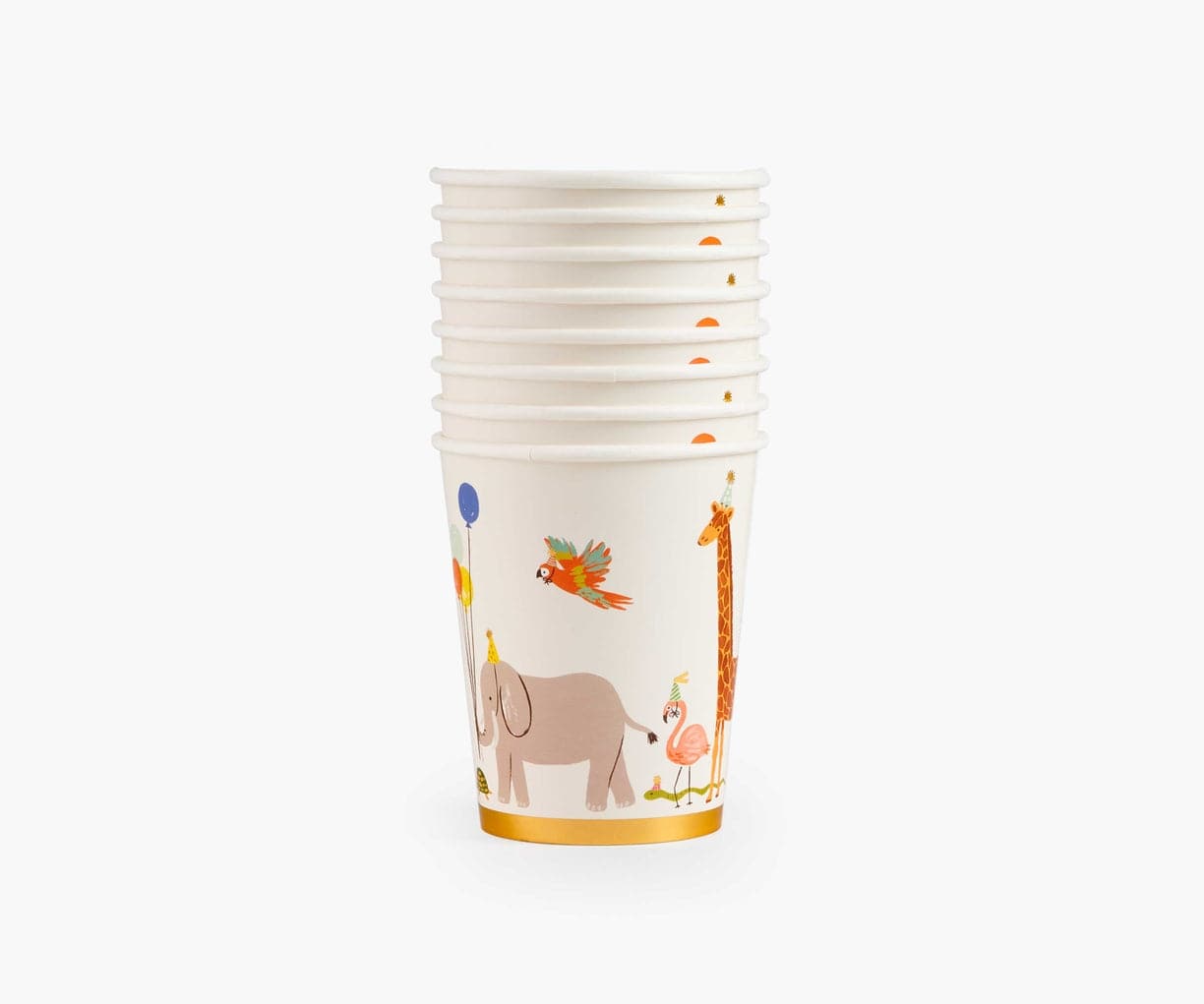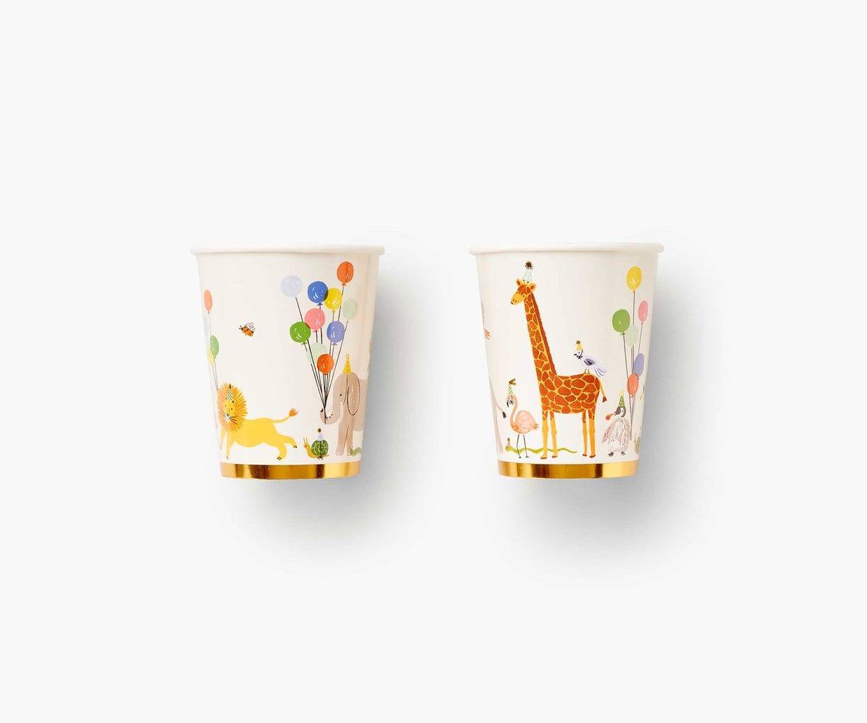 A parade of Party Animals march around our adorable paper cups with balloons, presents, and gold foil accents for extra fun!