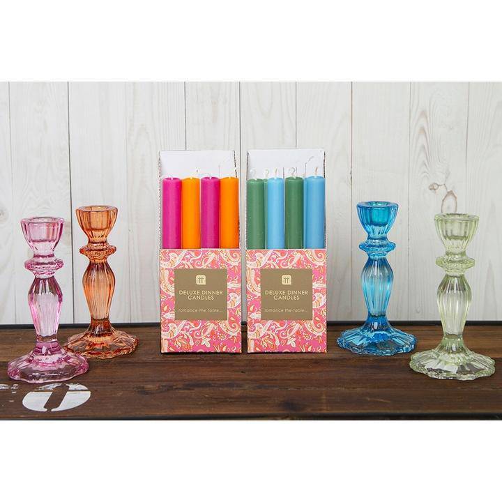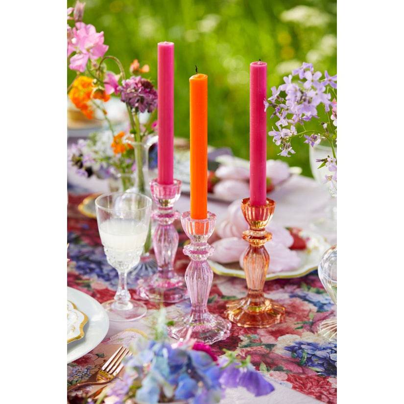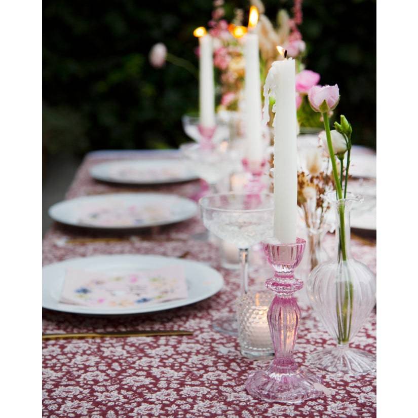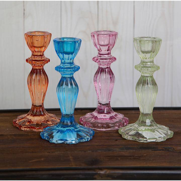 Set the scene and light up any gathering with this beautiful pink glass candlestick holder!