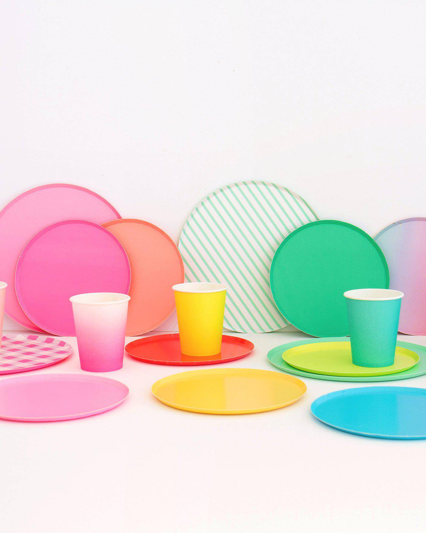 ITEM DETAILS: Set of 8 plates, Paper, 9" wide, Double sided color, Delicate low profile rim, Available in 20 colors, Designed in San Francisco.