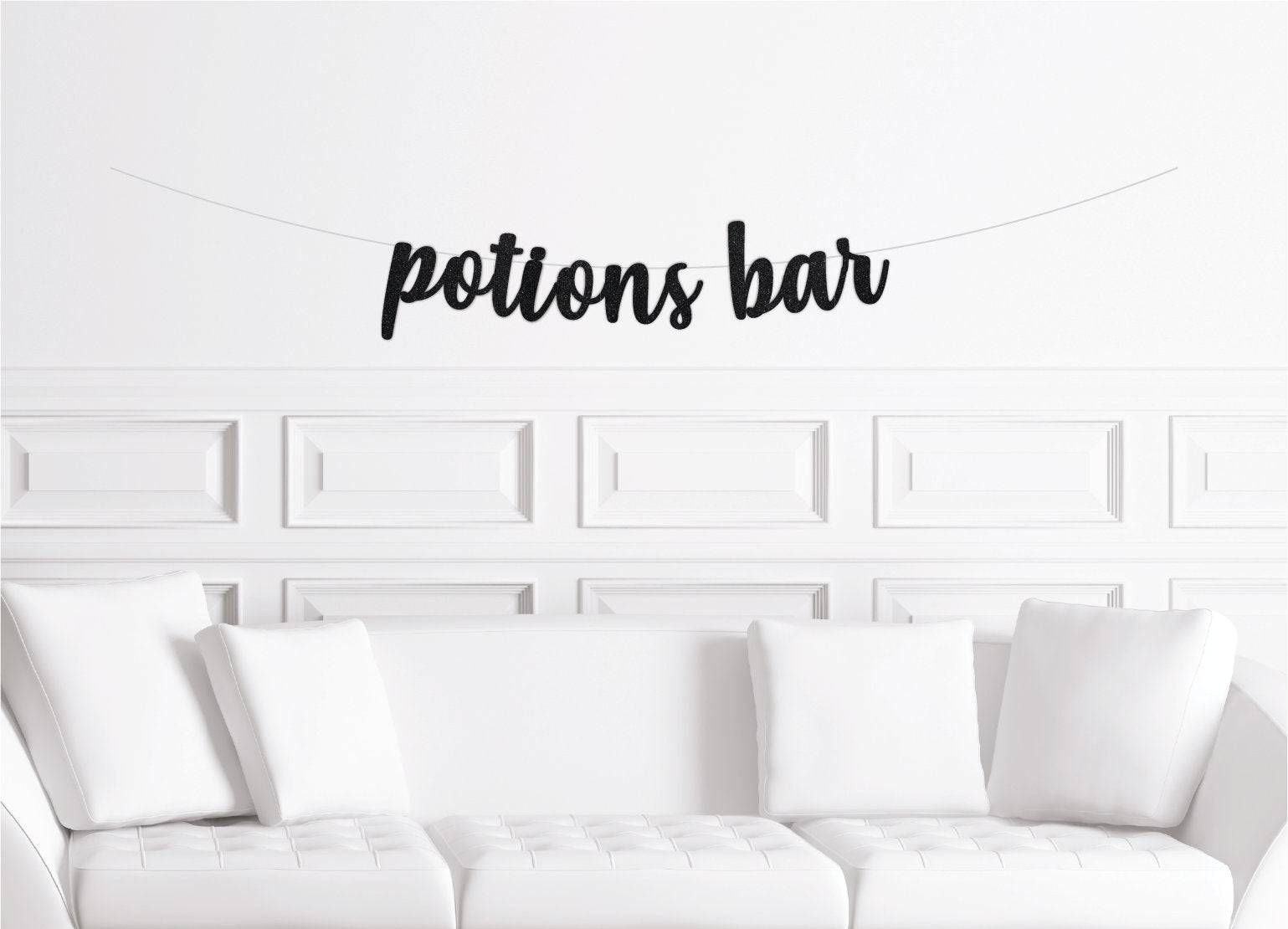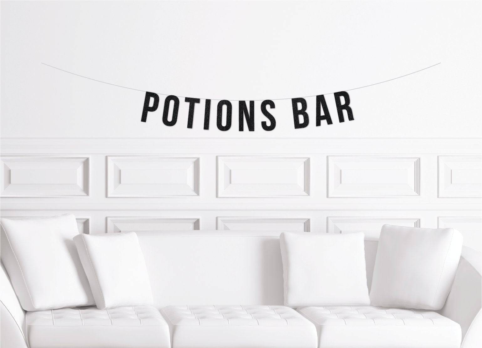 Potions Bar Halloween Party Banner Sign for a Drink Table This listing is for one paper, glitter script banner of the popular Halloween party phrase: