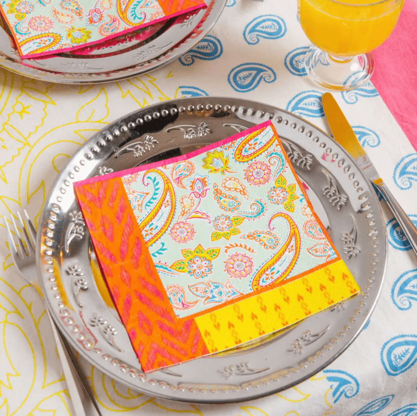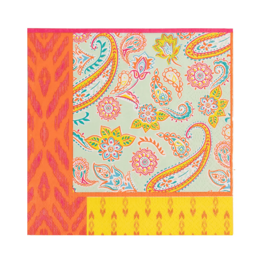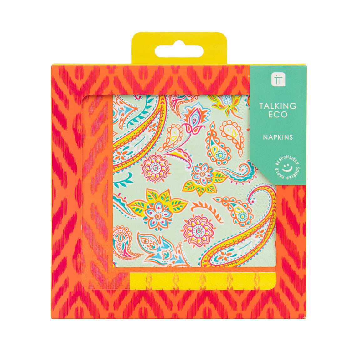 Pack of 20 Paisley Paper Napkins by Talking Tables. With a bright paisley print pattern, these colorful napkins are perfect for summer occasions from a boho birthday party to a picnic in the park. Better yet, you don't have to offer your customers boring brown napkins to be eco-friendly