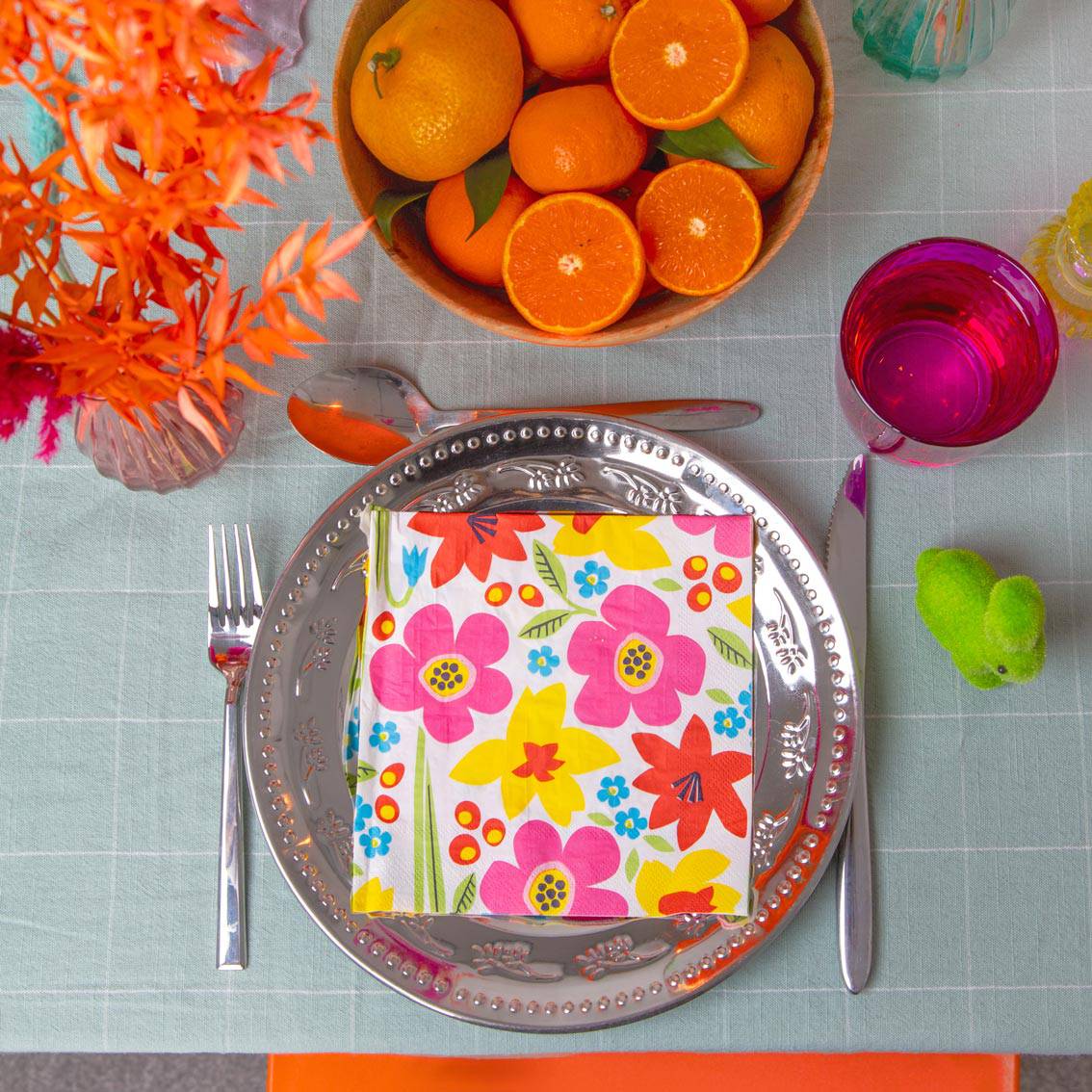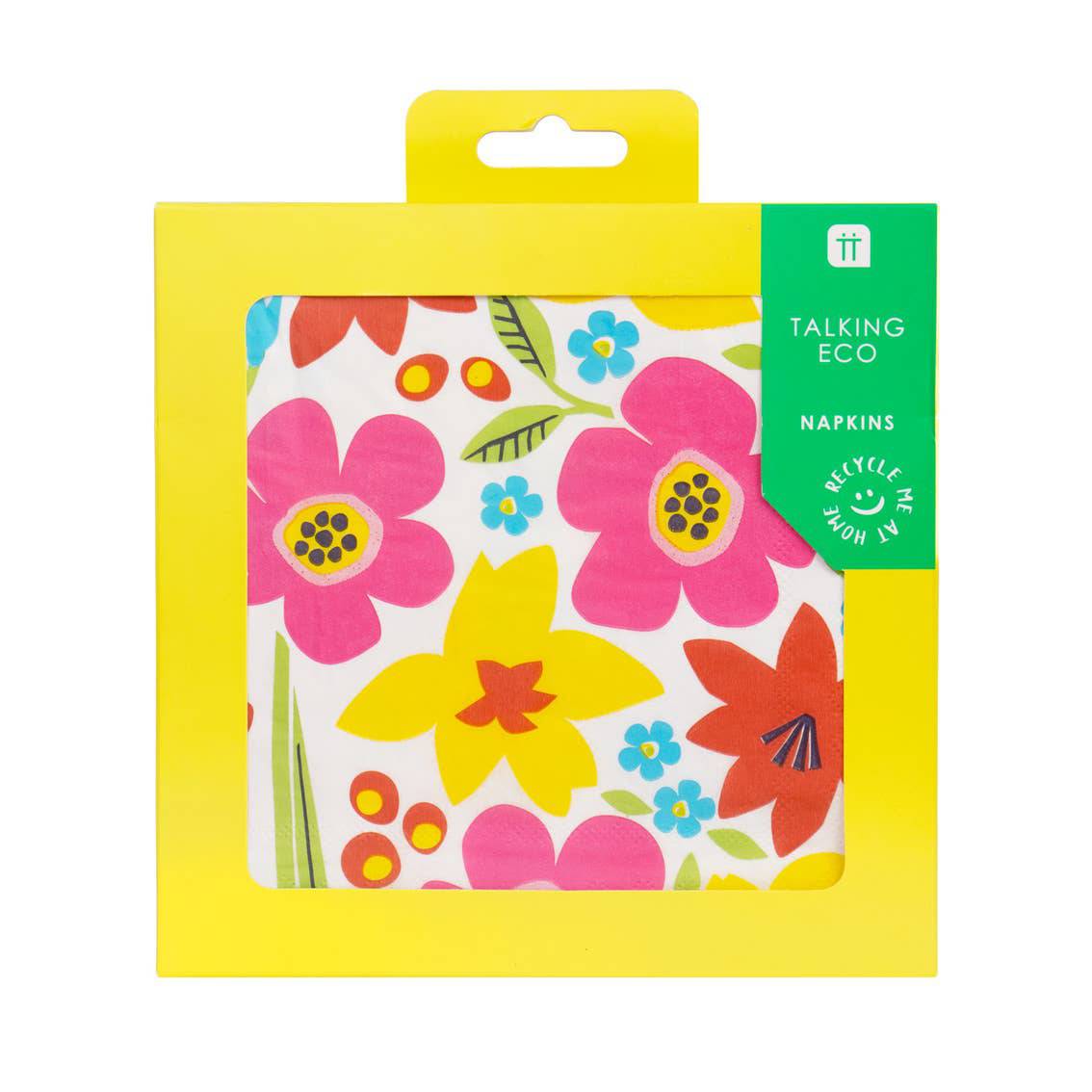 Pack of 20 Floral Paper Napkins by Talking Tables.  Brighten up your table this spring with these colorful floral napkins. With bright flowers in pink, blue, red and yellow, these disposable napkins are recyclable and come in plastic-free packaging. Instead of using plastic we have include an extra napkin at the front of pack to keep the rest clean - simply remove and throw away before using the others.