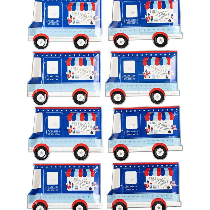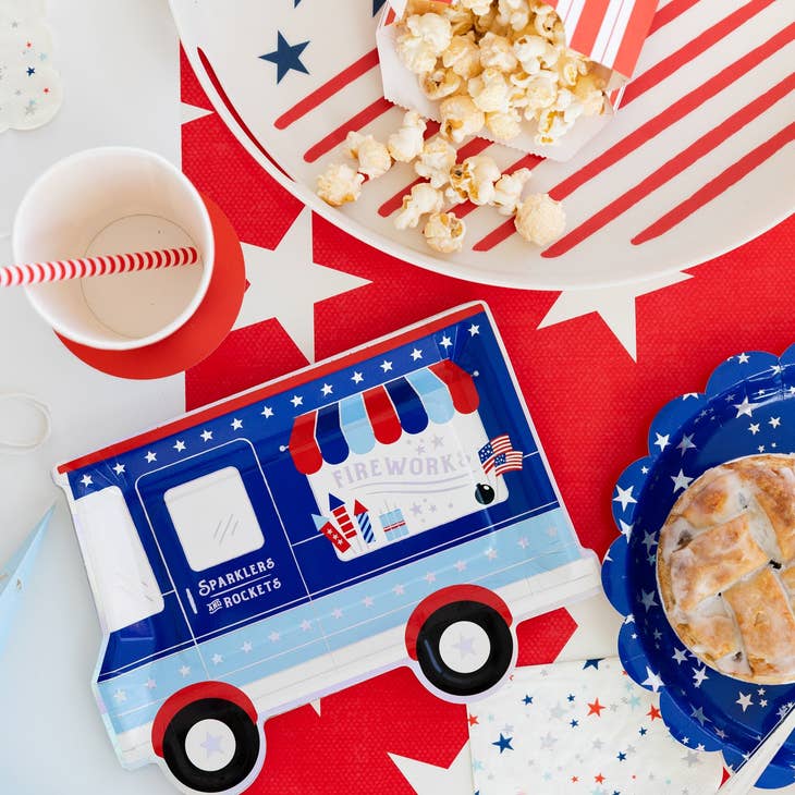 Get ready to light up your Fourth of July celebration with these dazzling Firework Truck Shaped Plates! Die cut into to charming firework truck shape, these dinner sized party plates will have your guests saying "hooray for the red, white and blue!" And the holographic foil accents will ensure that little ones and adults alike will be dazzled at the picnic table.